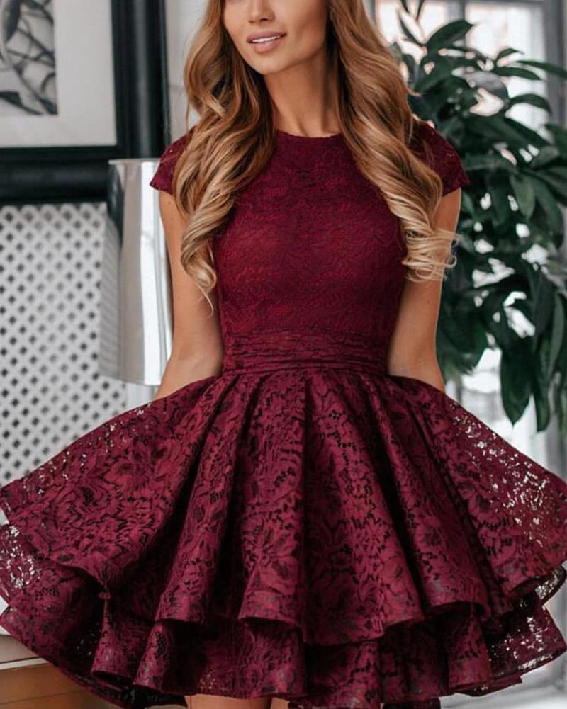 A-Line Round Neck Short Red Lace Homecoming Dress,SF0036