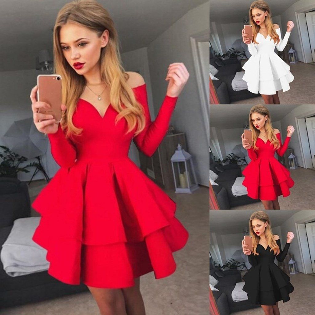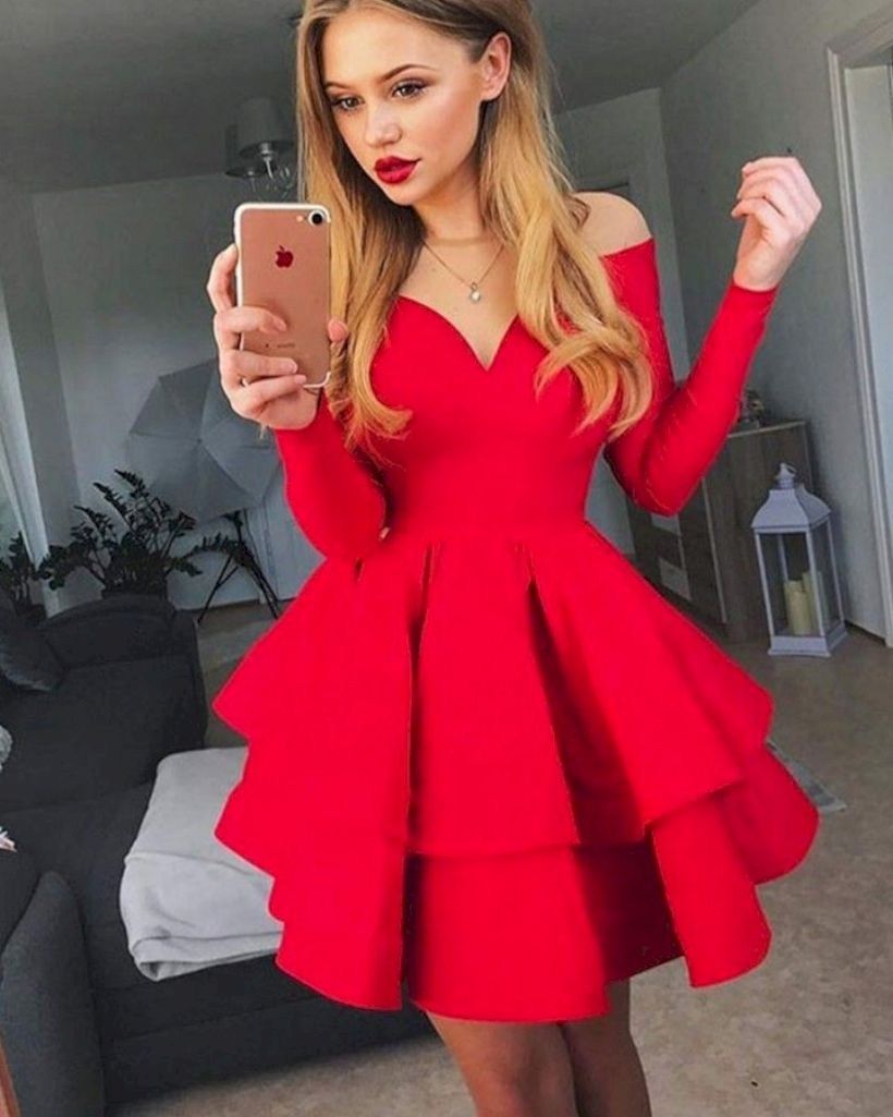 Sheer Red Satin Layered Skirt Homecoming Dress with Long Sleeves,SF0057
