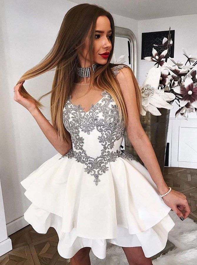 A-Line Round Neck Short White Tiered Homecoming Dress with Appliques,SF0078