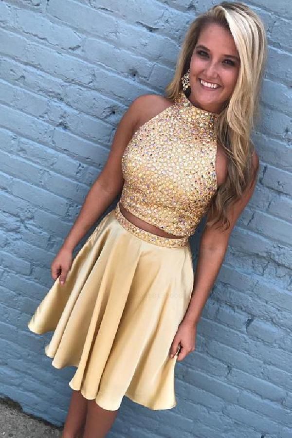 Two Piece Gold Beaded Short Prom Dress,High Neck A-Line Homecoming Dress,SF0093