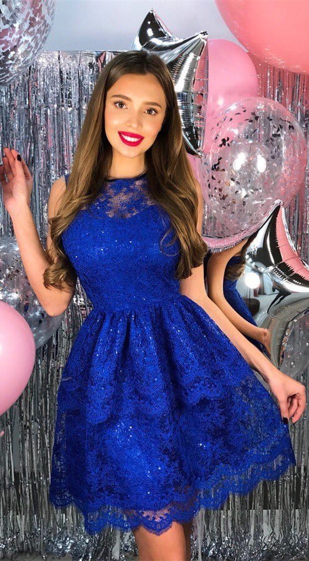 Cute Round Neck Floral Lace Beaded Royal Blue Short Homecoming Dress Cocktail Party Dress,SF0113