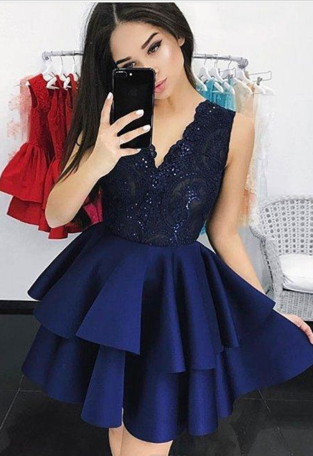Navy Blue Tiered Homecoming Dresses,Party Gowns V Neck Lace Bodice Sleeveless Sweet 16 Short Dress,SF0115