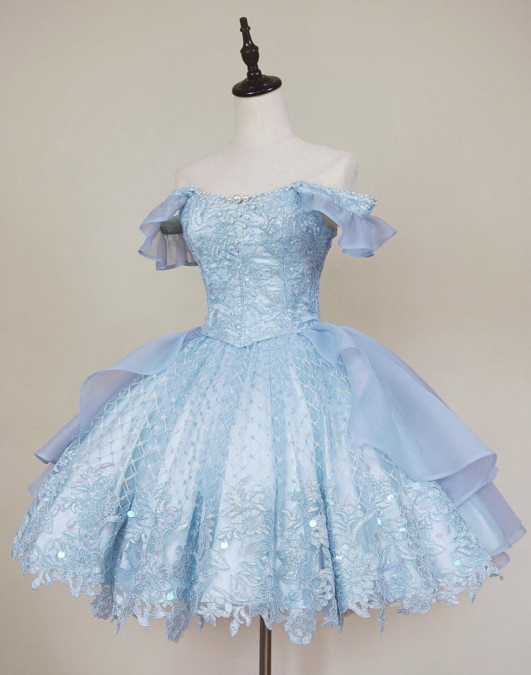 Vintage Blue Lace Homecoming Dresses,Off the Shoulder Prom Dresses,SF0126