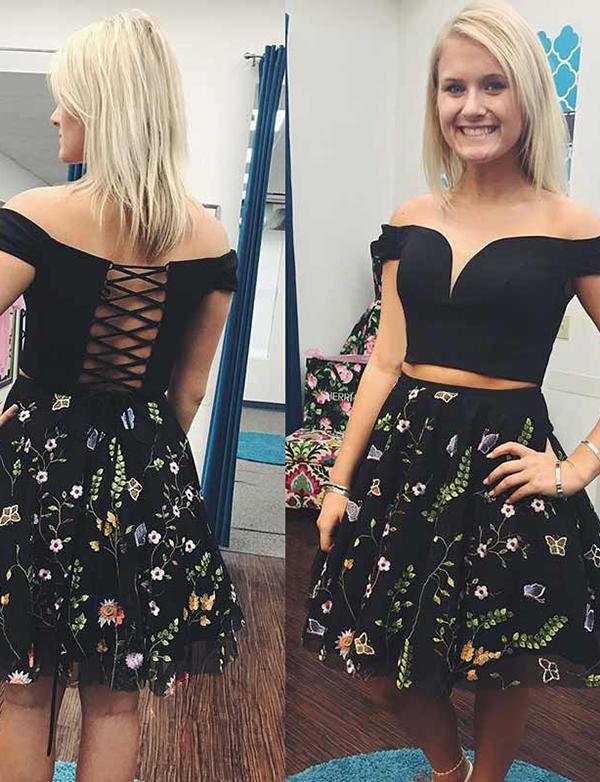 Black Two Piece Off Shoulder Homecoming Dresses With Flowers, Knee Length Black Dress,SF0156
