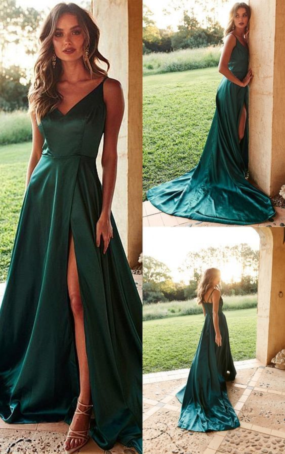 V Neck Side Slit Sexy Long Prom Dresses Green Formal Gown,SF0158