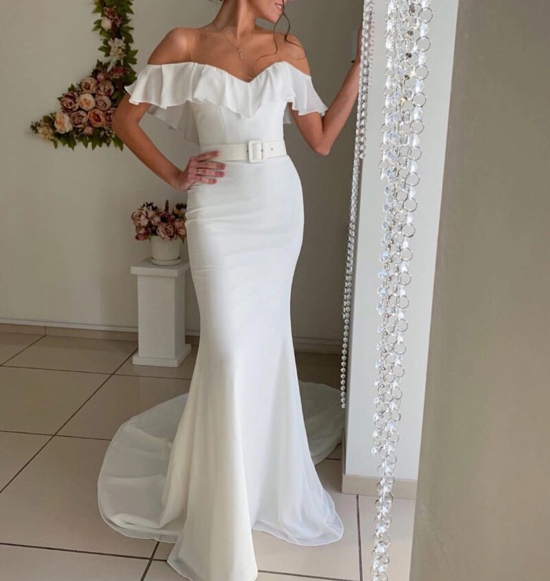 White Mermaid Sweep Train Chiffon Prom Dresses,Trumpet Off The Shoulder Wedding Gown,SF0301