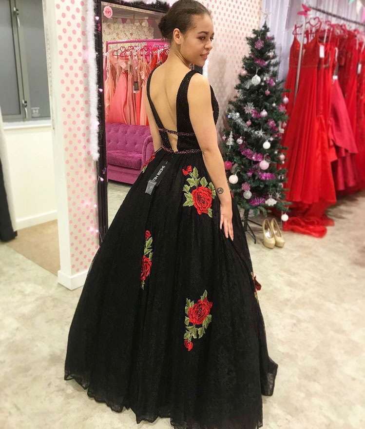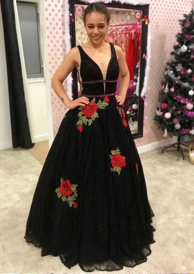 Black A-Line Plunge V-Neck Backless Lace Rose Floral Appliques Prom Dress,SF0326