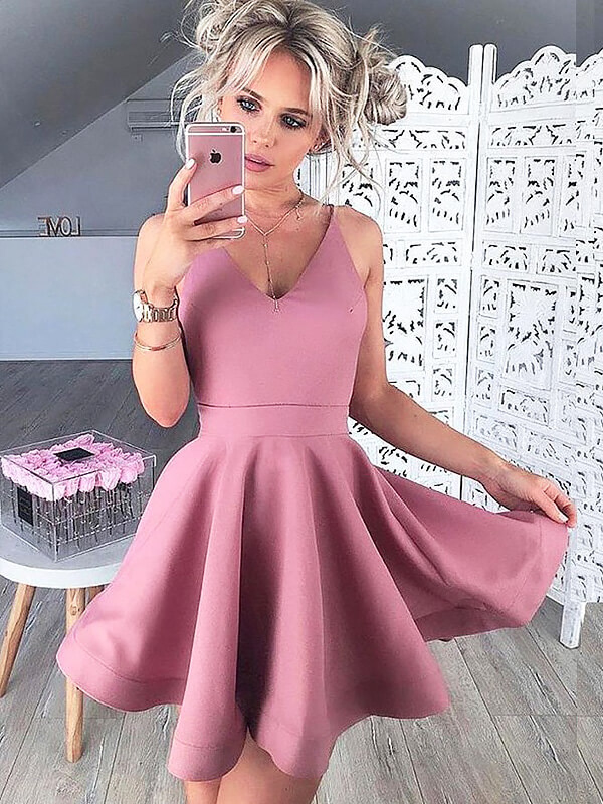 Pink V-Neck A-Line Homecoming Dresses,Satin Pink Graduation Dress,SF0347