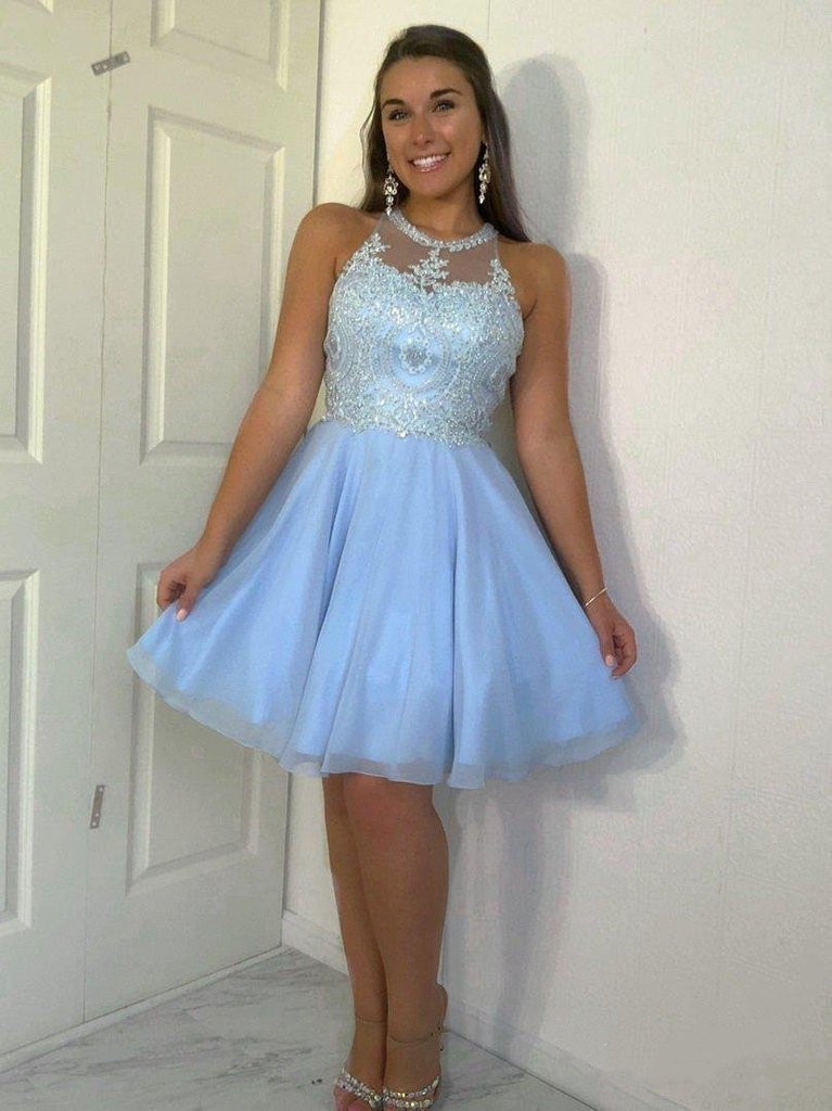 Blue Halter A Line Pleated Tulle Appliques Knee Length Sleeveless Homecoming Dresses,SF0362