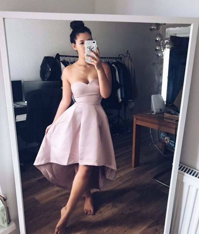 Simple Pink Sweetheart Hi-Lo Homecoming Dresses,Satin Pink Mini Prom Dress,SF0376