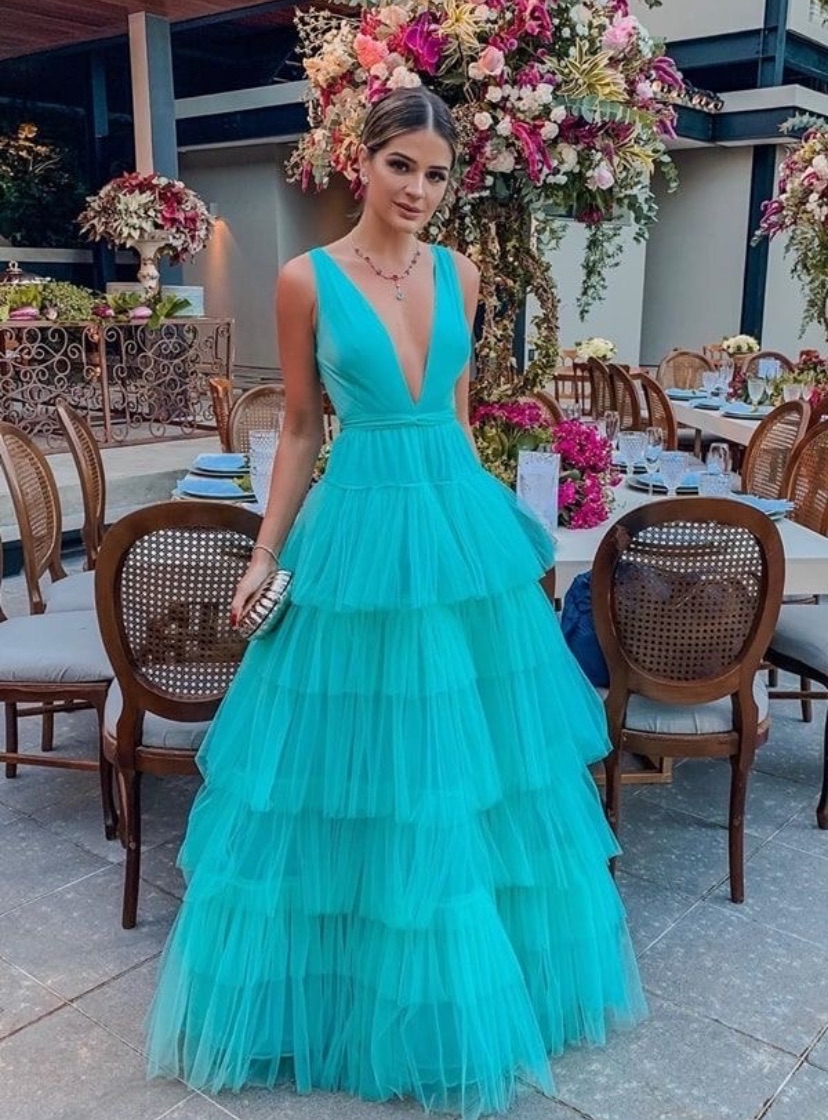 Deep V-neckline Tulle Prom Dress Tiered Skirt Long Party Gowns,SF0391