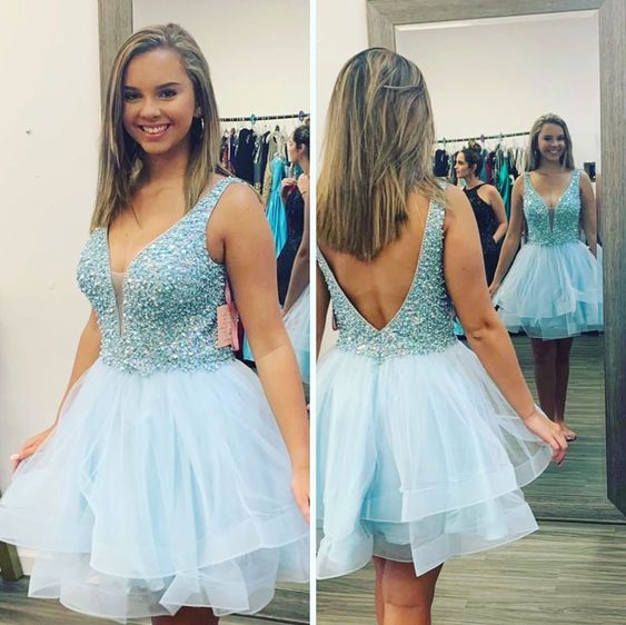 V-Neck Homecoming Dress,Short Prom Dress,Back To School Party Dress,2021 Evening Dress,Light Blue Formal Dress,SF0396