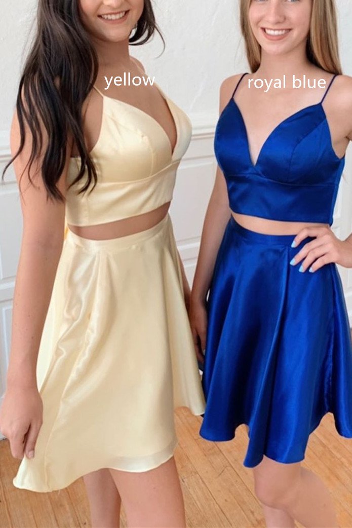 A-Line Satin Two Piece Spaghetti Strap Homecoming Dress With Open Back,SF0403