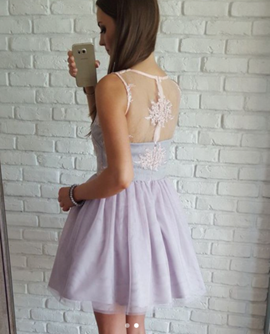 V-neck Lavender Lace Bodice Short Homecoming Dress with Tulle Skirt,SF0430