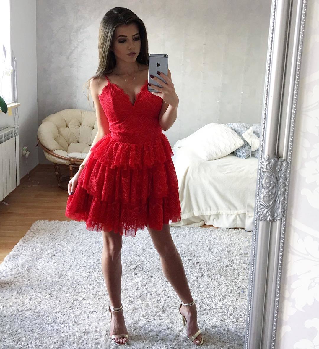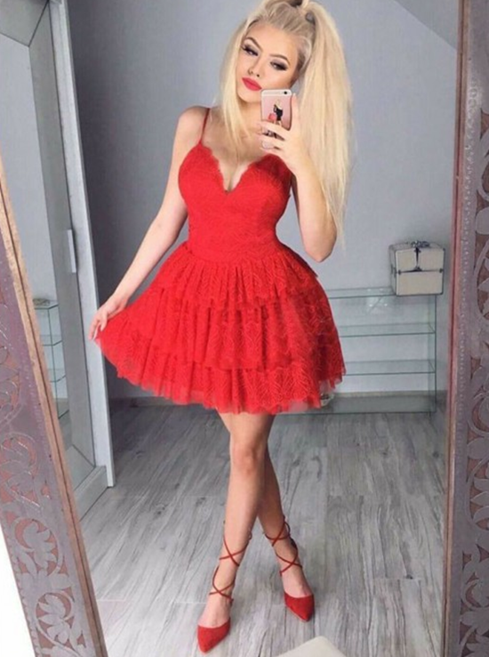 Fit and Flare Red Spaghetti Straps Layered Lace Homecoming Dress,SF0431