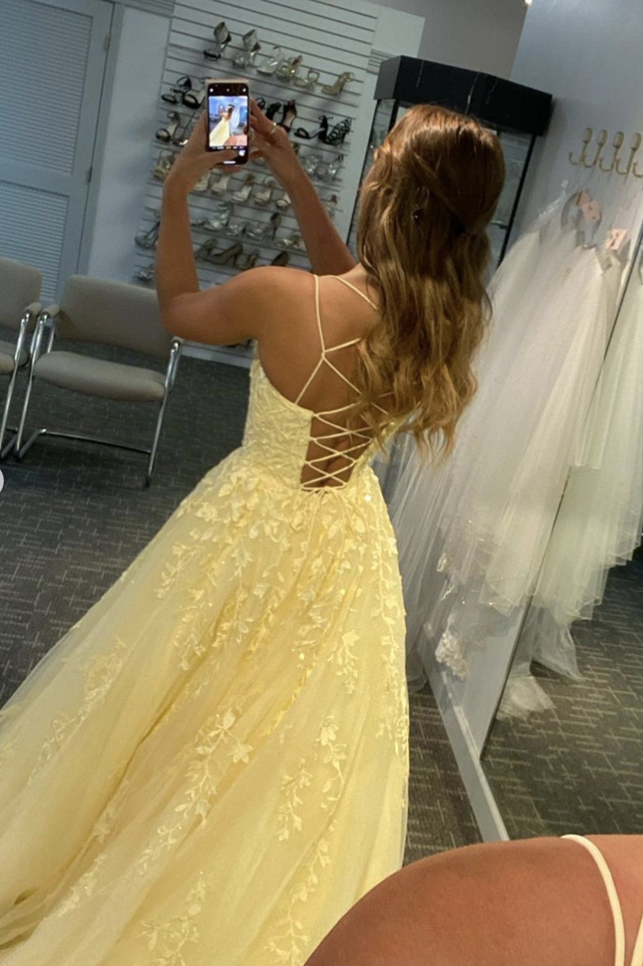 Yellow lace long A line prom dress lace evening dress ,SF0493