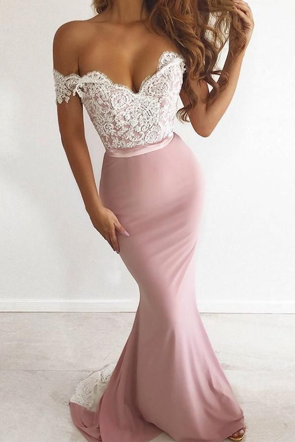 Unique Pink Off the Shoulder Mermaid Lace Long Prom Dresses Cheap Party Dresses,SF0499