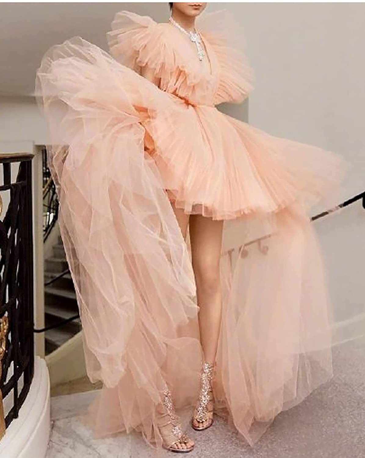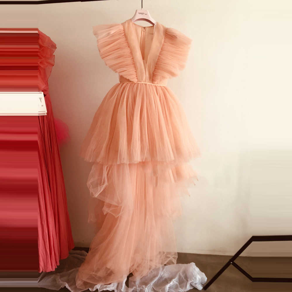Pretty Tulle Long Prom Dresses,V-Neck Evening Dress,High Low Party Dress Night Dance Gown,SF0501