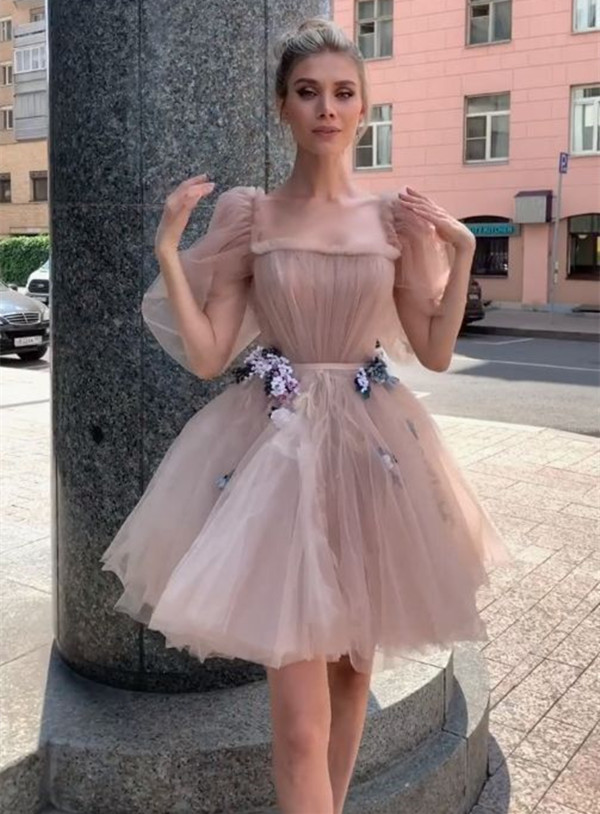 Cute Bubble Sleeves A-Line Homecoming Dresses,Tulle Applique Pleated Prom Dress,SF0505