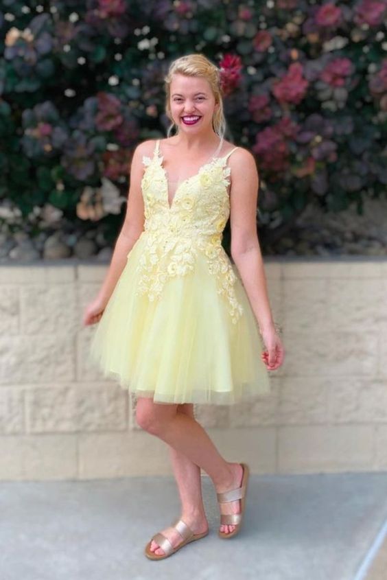 Pastel Yellow Lace Tulle Homecoming Dresses,A-Line Graduation Dress,SF0510