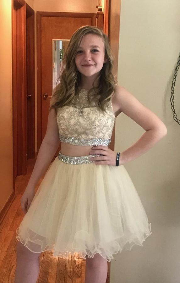 Light Yellow Organza Two Pieces Homecoming Dress,Applique Beaded Graduation Dresses,SF0514
