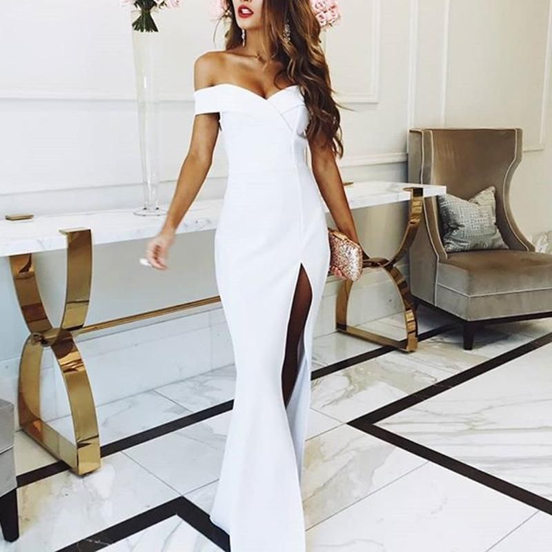 White off the shoulder mermaid prom dresses,satin event dress,SF0523